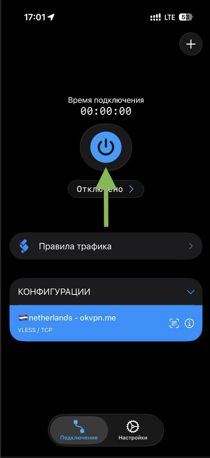 Вы успешно вставили ключ. Нажмите на синюю кнопку в центре, чтобы включить VPN. После подключения кнопка станет зеленой. Чтобы отключить VPN — нажмите на зеленую кнопку