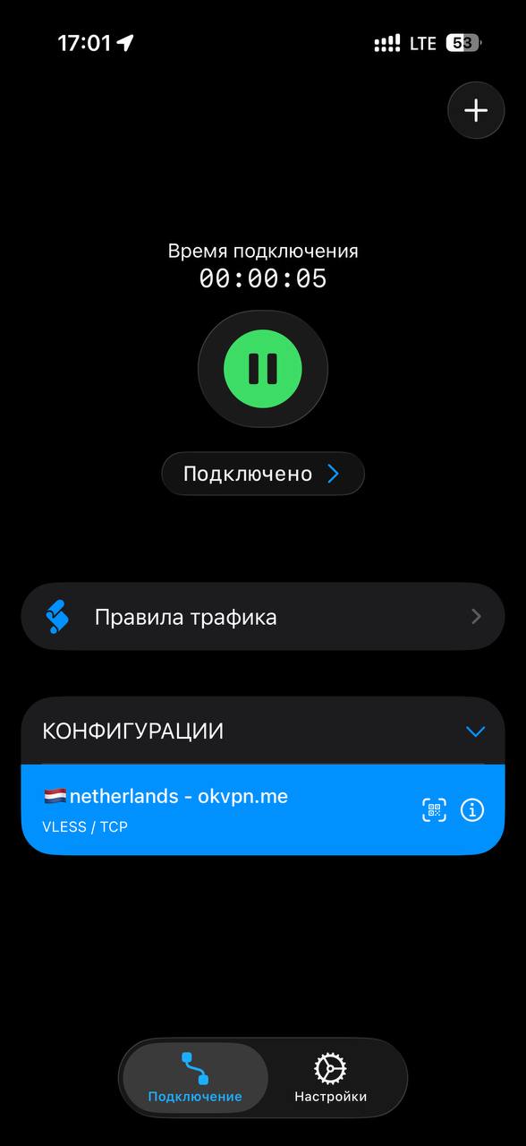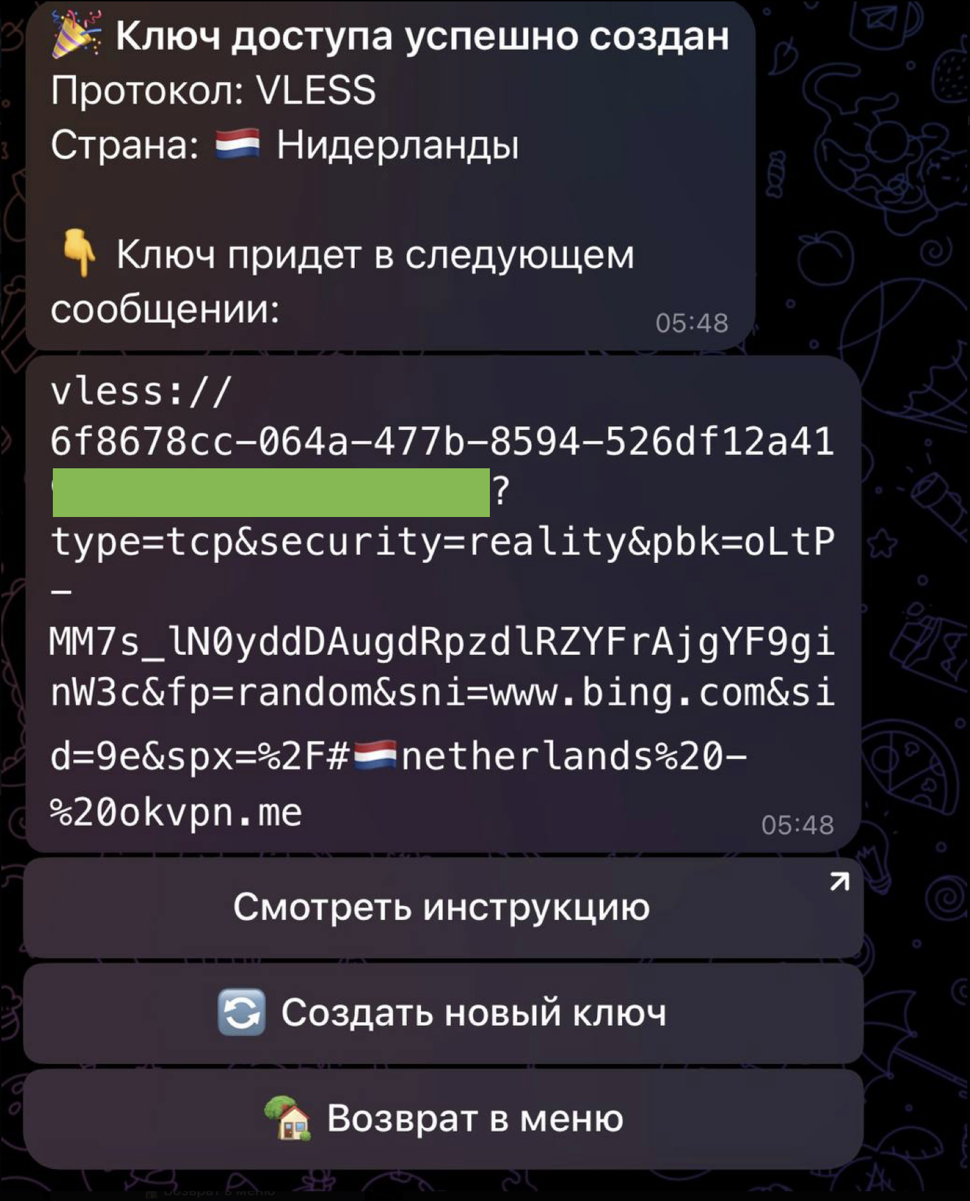 Вам нужен ключ, который выглядит как большая строка со случайными символами и начинается с vless://. Ключ приходит после оплаты, но его всегда можно заново получить, если есть активная подписка на OKVpn
